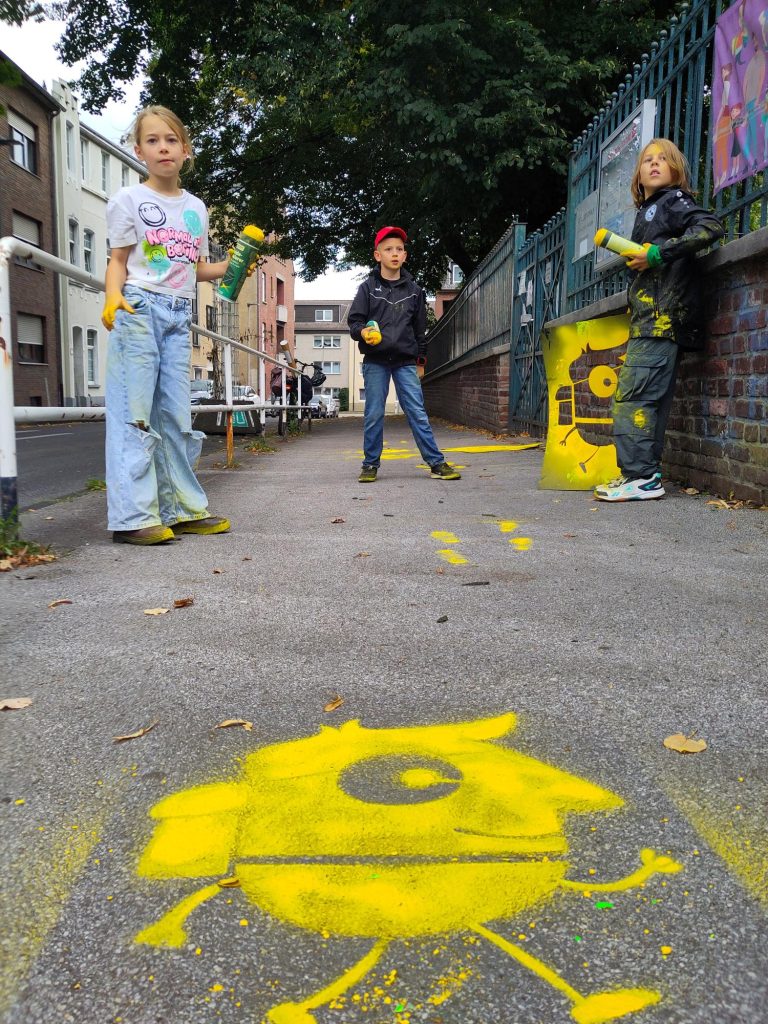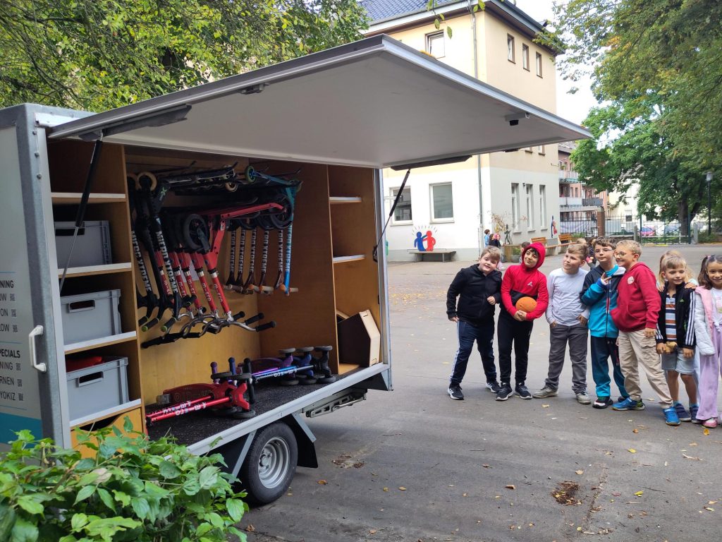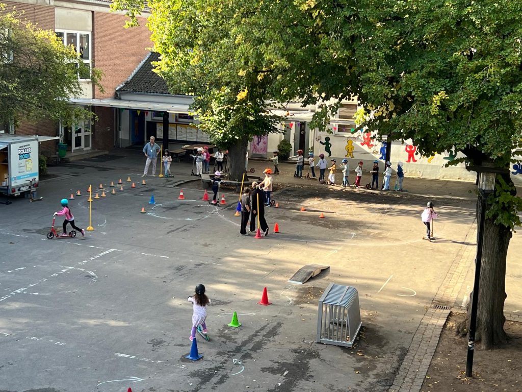 Während der Woche erarbeiten die Schulkinder in der Schule das Thema Mobilität und warum es so gut ist zu laufen oder mit dem Fahrrad zu fahren. Sie bereiten Aktivitäten vor, die am Freitag, 19. September vorgestellt werden. Von 7 bis 15 Uhr ist die Straße dann durchgängig gesperrt. Der Förderverein organisiert eine Cafeteria, im Straßenraum wird es einen Rollerparcours und Bewegungsspiele geben und die Kinder können mit Straßenkreide die Straße gestalten. Außerdem wird die Stadtverwaltung vertreten sein und Feedback einholen, was Kinder, Eltern und Anwohner von einer Schulstraße halten. Auch die Inrather Straße, die ja eine Fahrradstraße ist, wird diskutiert werden.